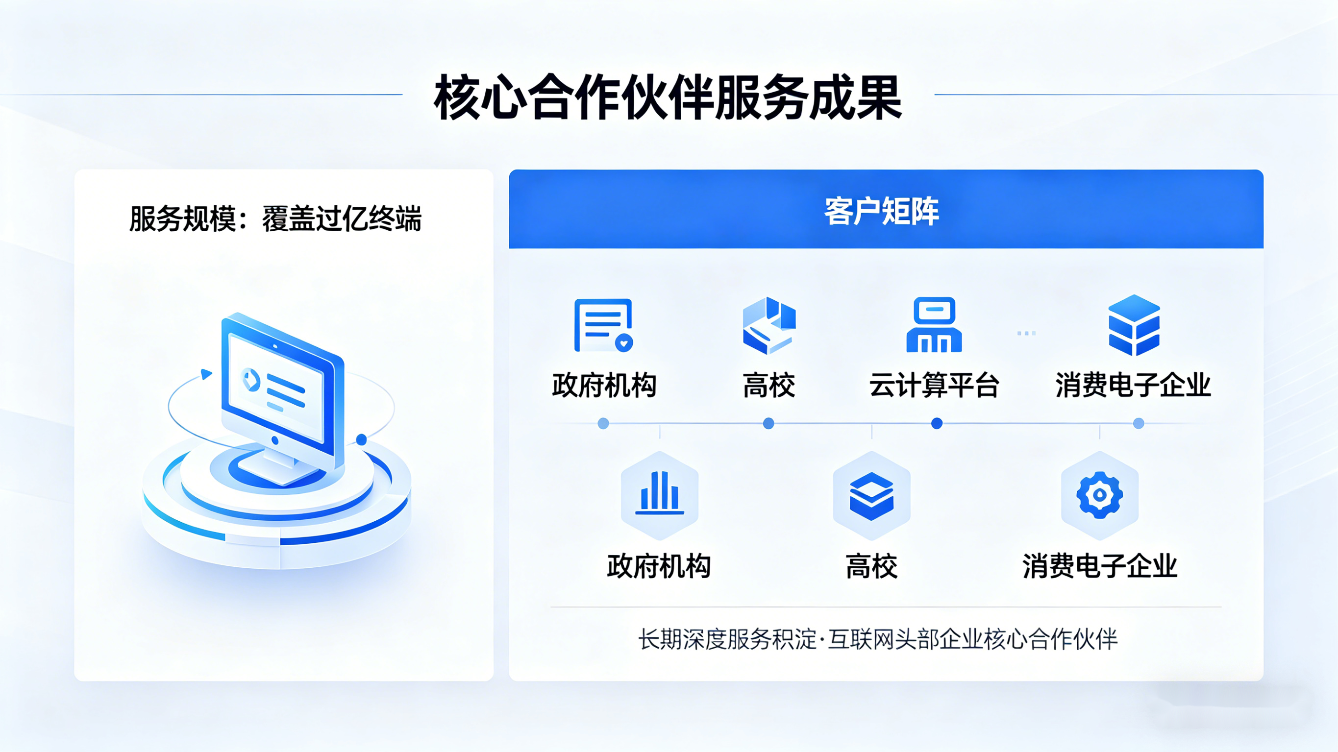 我们凭借长期深度服务积淀,我们已成为众多互联网头部企业的核心合作伙伴,服务规模覆盖过亿终端。客户矩阵涵盖政府机构、高校、云计算平台及消费电子企业等多元主体。