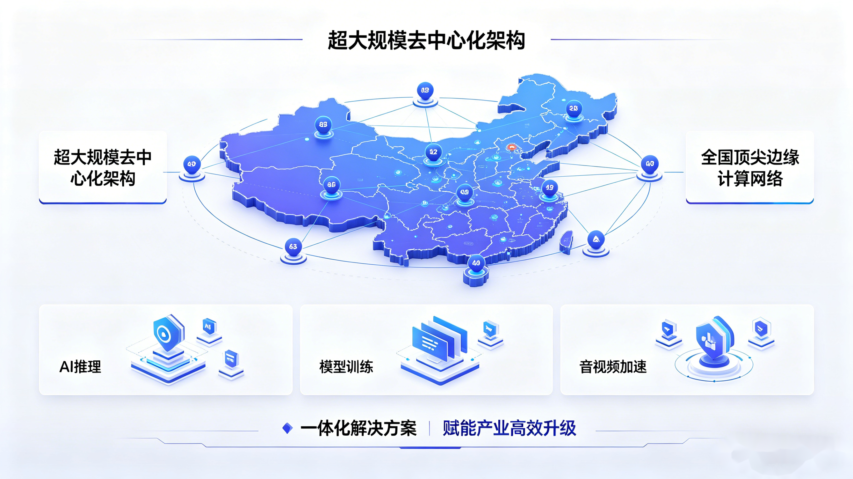 凭借超大规模去中心化架构,我们构建了全国顶尖的边缘计算网络,为各行业提供一体化解决方案,深度适配 AI 推理、模型训练、音视频加速等多元化业务场景,赋能产业高效升级。